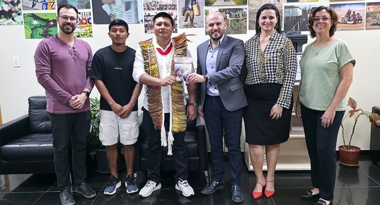 Para tratar do assunto, o diretor-geral do TRE Pará, Bruno Almeida, acompanhado da secretária de Planejamento, Elaine Santana; do assessor da Ouvidoria, Rodrigo Valdez, e da chefe da Seção de Gestão da Sustentabilidade Ambiental e Social, Lísia Dias, recebeu o presidente da Associação dos Povos Indígenas do Mapuera (Apim), Valnei Wai Wai, na quinta-feira (29), na sede do Tribunal, em Belém.